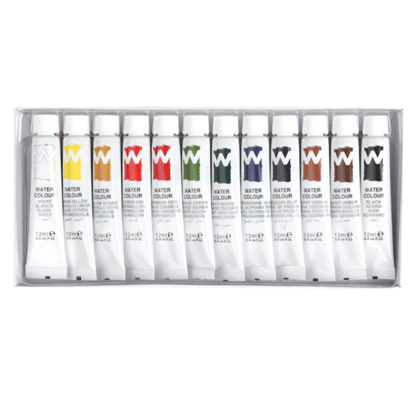 Watercolor painting. Ideal for diluting with water and using the wet technique to achieve different ranges of transparent and delicate colours. Fast dry. The colours can be mixed with each other creating new shades. Box of 12 tubes of 12 ml in assorted colours.