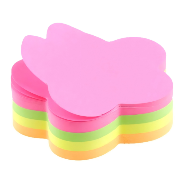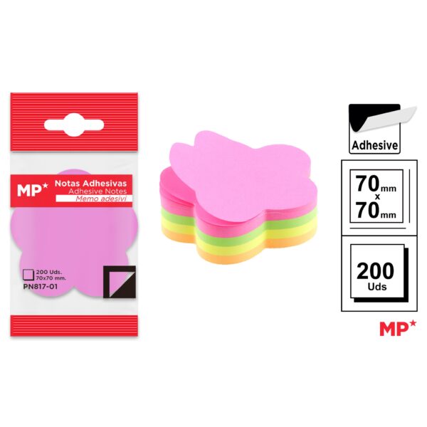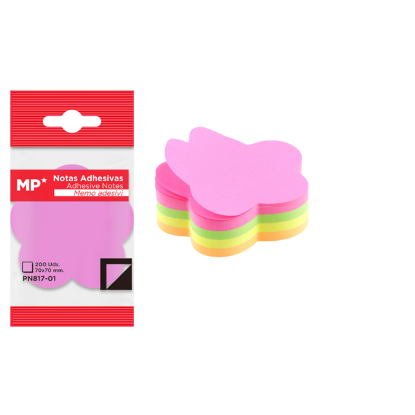 Repositionable sticky notes with funny shapes. Pad of 200 sheets. Measurements: 70 x 70 mm. 75 g/m2 paper. Neon colors: pink, green, orange and yellow. Blister presentation.
