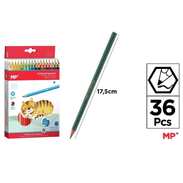 Colour pencils with hexagonal wooden body. Intense or pastel colours that can be mixed together. Tip very resistant to sharpening and shock. Does not splinter Ideal for colouring and drawing. Box of 36 colours.