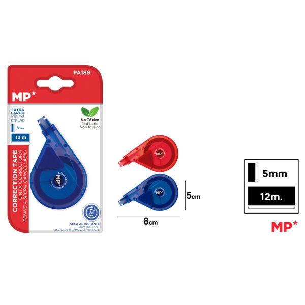 It allows writing on it instantly. Great opacity. Side correction. Non-toxic. Glides smoothly over paper without jamming. Tape width: 5 mm Length: 12 m. Extra long.