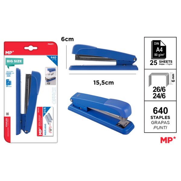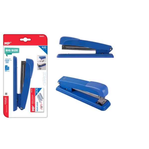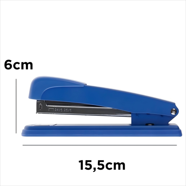 Large stapler made of resistant metal with metal mechanism and plastic button. Maximum stapling capacity: 25 sheets. Staple load: top. Stapling type: open and closed. Stapling length at 90 mm from the edge of the sheet. Use 24/6 and 26/6 staples. Stapler measures: 157 x 40 mm. Includes a box of 640 24/6 staples. Available in 2 assorted colors: blue and black. Blister of 1 unit.