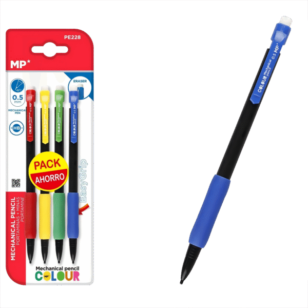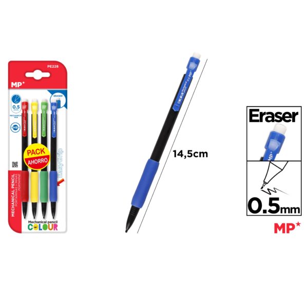 Mechanical pencil with round black plastic with colored details. 0.5 mm HB lead. With eraser on the button. Color-matched retaining clip with the grip. Easy grip for comfortable writing, very soft and pleasant to the touch. Blister of 4 units in blue, red, yellow and green