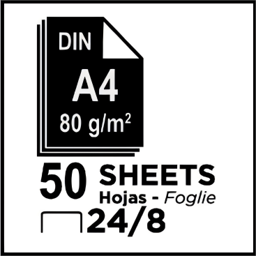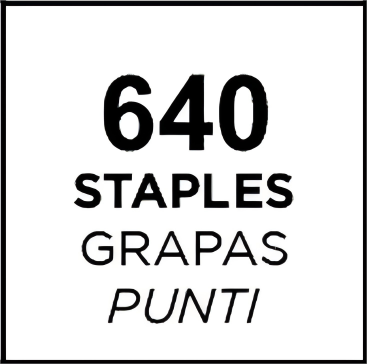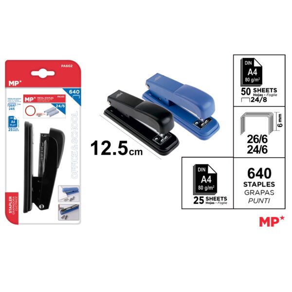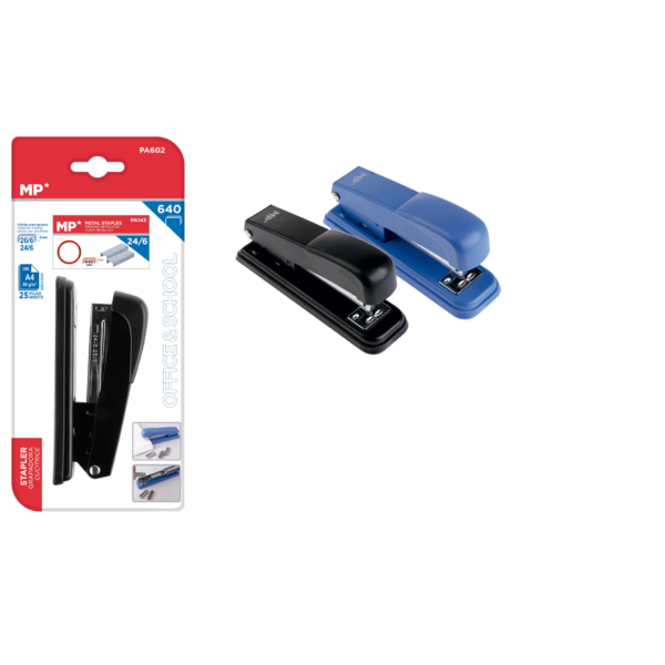 Medium stapler made of resistant metal with metal mechanism and black rubber button for greater comfort. Maximum stapling capacity: 25 sheets. Staple load: top. Stapling type: open and closed. Stapling length at 60 mm from the edge of the sheet. Use 24/6 and 26/6 staples. Stapler measures: 126 x 40 mm. Includes a box of 640 24/6 staples. Available in 2 assorted colors: blue and black. Blister of 1 unit.