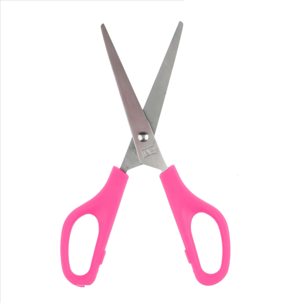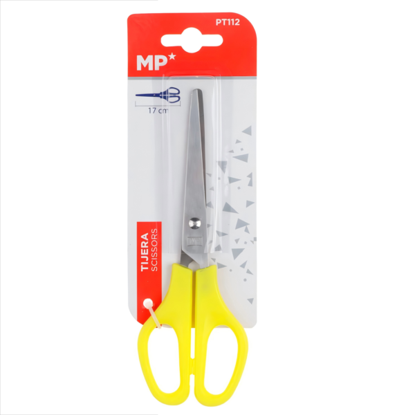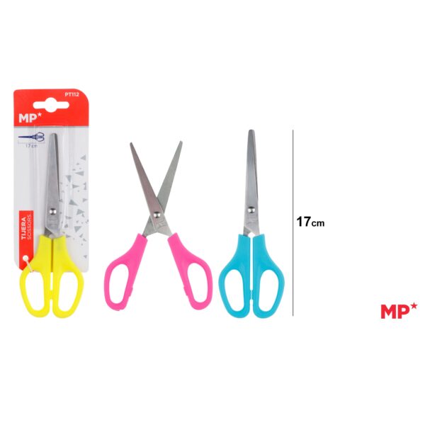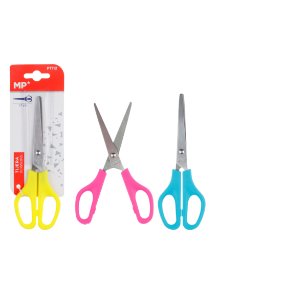 Scissors with plastic handle and steel blades. Rounded tips to prevent cuts and punctures. Size 17 cm. Assorted colors: yellow, pink and blue. Blister of 1 unit.