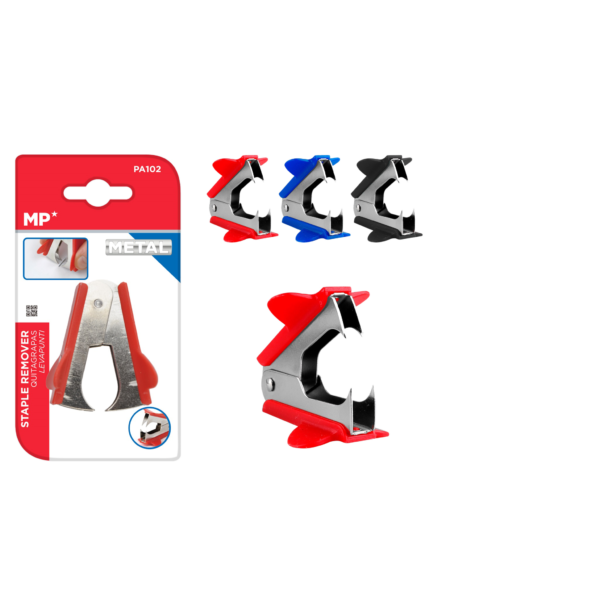 Staple remover to remove all types of staples. Easy to handle and remove staples without hurting your fingers. Plastic body. Metallic mechanism. Assorted colours available: blue, black and red. Blister of 1 unit.